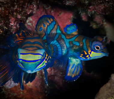De mandarijnvis is een van de meest kleurrijke vissen onder water. Met zijn felle oranje, blauwe en groene strepen ziet hij eruit als een schilderij. Je vindt ze vaak in paren, vooral bij schemering, wanneer ze uit hun schuilplaatsen komen. Veel duikers plannen speciaal een avondduik om deze prachtige vis te kunnen zien.