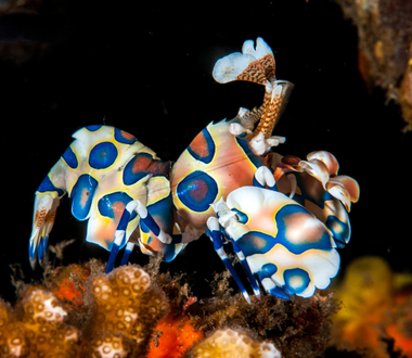 Deze garnaal herken je meteen aan zijn witte lijf met roze en blauwe vlekken. Ze leven vaak in paartjes en blijven meestal rustig zitten. Hun favoriete maaltijd is een zeester. Door hun opvallende uiterlijk zijn ze erg populair bij onderwaterfotografen.