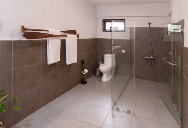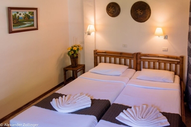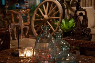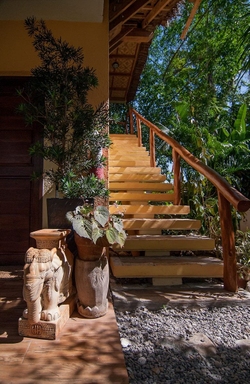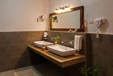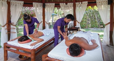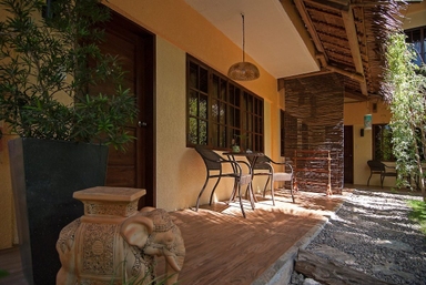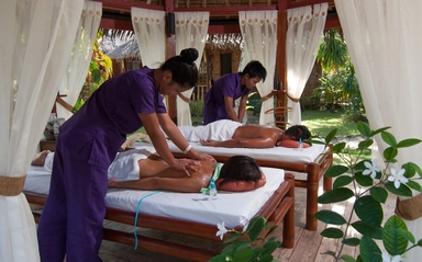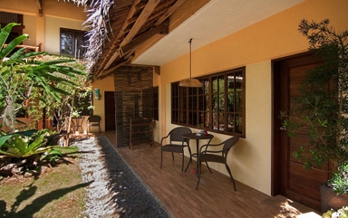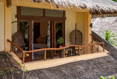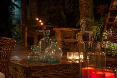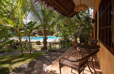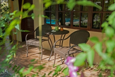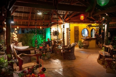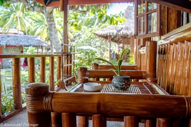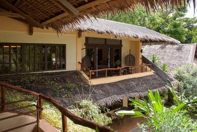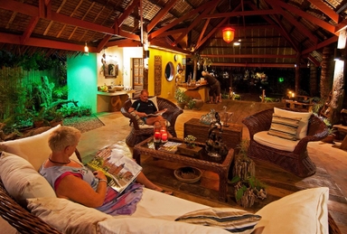 Net als de cottages is het restaurant gebouwd van inheemse materialen. Doordat het restaurant aan drie kanten open is, kunt u er maximaal genieten van het prachtige uitzicht op het zwembad en de tuinen. Hier wordt ‘s ochtends ook het ontbijt geserveerd.