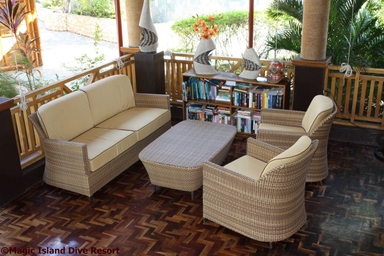 De lounge hoek in het restaurant heeft een kleine bibiliotheek waar je vele boeken over het onderwaterleven kunt vinden. Jouw hele verblijf is er gratis water beschikbaar op het resort.