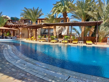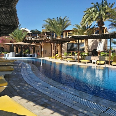 Het zwembad van het resort is ideaal gepositioneerd aan het belangrijkste kustgedeelte van Dahab en heeft vrij uitzicht over de Golf van Aqaba. Geniet bij het zwembad van uw favoriete drankje aan onze half-verzonken bar of neem plaats op een van onze vele ligstoelen rond het zwembad en wentel jezelf in prachtige vergezichten over de bergen en de zee.