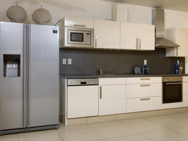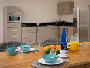 Luxe ingerichte open keuken & woonkamer met toegang tot het erg grote overdekte balkon. Het appartement beschikt over 3 slaapkamers waarvan 2 met een 2 persoonsbed en 1 met 2 enkele bedden en 2 badkamers. 1 Van de penthouses beschikt tevens over een jacuzzi!