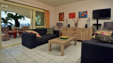 Luxe ingerichte woonkamer, volledig uitgeruste keuken, 1 grote slaapkamer met kingsize bed, 1 badkamers en een groot overdekt terras. Op bovenverdieping van deze appartementen bevinden zich ook nog 2 slaapkamers (met beide 2 enkele bedden) en 1 badkamer.