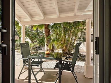 De studio heeft een knus overdekt terras / veranda, kabel-tv, airconditioning, plafondventilator, kluisje, kitchenette met 2-pits kookplaat en koelkast. Badkamer met warm en koud water douche, buitendouche, linnengoed en handdoeken.