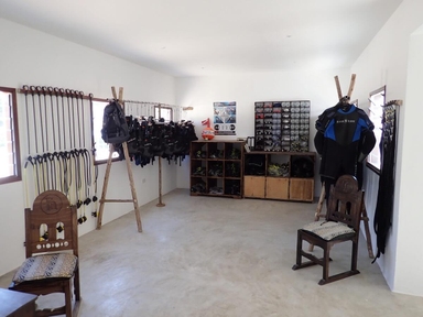 Extra Divers Temple Point is voorzien van 50 12 liter aluminium tanks met DIN ventielen, INT adapters, Nitrox tegen betaling, 12 volledig nieuwe uitrustingen van Aqualung, droogruimte, UW camera verhuur en twee duikboten met EHBO benodigdheden.