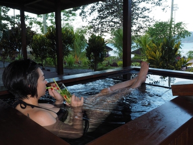 Toe aan relaxen en wellness? Ook dan ben je bij Dive into Lembeh aan het juiste adres. Het resort beschikt over een zwembad, een spa met 3 massage ruimtes en elke bungalow heeft een eigen Japanse Onsen (badgelegenheid met water uit een geiser). Bij het grote zwembad (18x6 meter) kun je genieten van de zon, op het daarvoor bestemde zonneterras. Wordt het je te warm in de brandende zon? Dan is het fijn om te weten dat het openlucht restaurant en de bar beschikken over plafondventilators. De ervaren koks bieden u een ruime selectie van lokale en internationale gerechten.