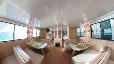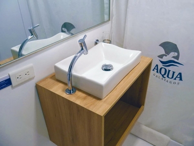 Aqua biedt ruimte voor 16 duikers, in 8 ruime cabines. De cabines liggen verdeeld over de verschillende dekken, zo ook de gemeenschappelijke ruimtes. Op het maindek vind je naast de cabine ook de lounge, eetkamer, keuken en natuurlijk het duikdek. Op het upperdek vind je nog 5 cabines met achteraan het dek een bar met overdekte buitenlounge en de trap naar het zonnedek.