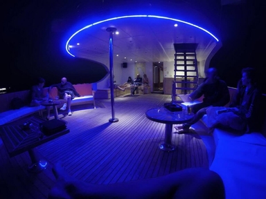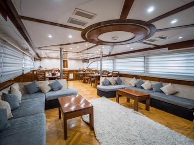 Grote salon met Audiovisueel station (TV, video, CD / DVD stereo systeem), airco, laadstation, Spoel tank voor camera's, bar, ijsmaker en bibliotheek.