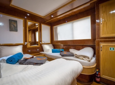 Hutten: 10 x tweepersoons hutten met 2 aparte bedden (8 benedendeks & 4 bovendeks), prive badkamer met douche, WC en airco. Badhanddoeken en badjassen zijn standaard in alle hutten.