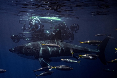 “Daal af tot een diepte van 9 meter en sta oog in oog met witte haaien, in hun natuurlijke leefomgeving!”