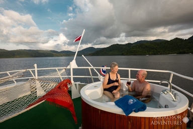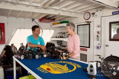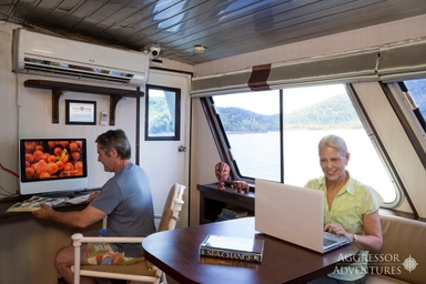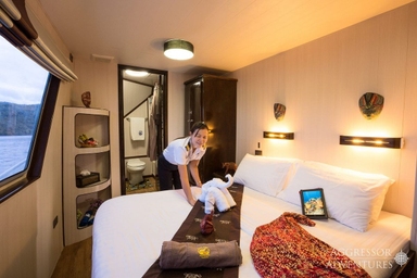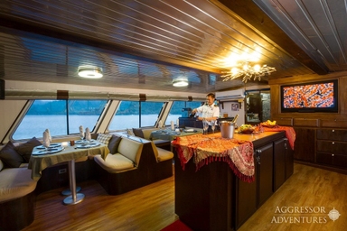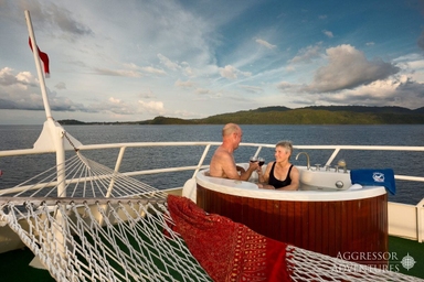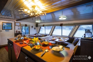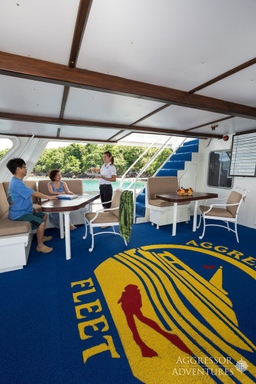 Op de Aggressor kom je ook aan ontspanning niks te kort, met een mega zonnedek vol hangmatten en ligstoelen, plus een salondek met eetgedeelte en buitenterras. De hutten en duikdek bevinden zich op het hoofddek, terwijl de suite en de bibliotheek op het benedendek te vinden zijn. Voor de onderwater-fotografen is er volop ruimte om je apparatuur klaar te stomen voor de volgende duik.