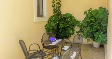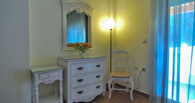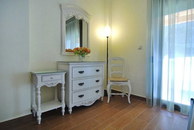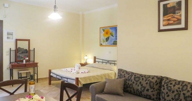 De studio ligt op de begane grond van de villa, met een ruime terras en dichtbij de tuin en het zwembad! De studio's bieden ruimte tot maximaal 4 personen. De ruime kamer beschikt over een tweepersoonsbed en een slaapbank, die uit 2 eenpersoonsbedden bestaat.